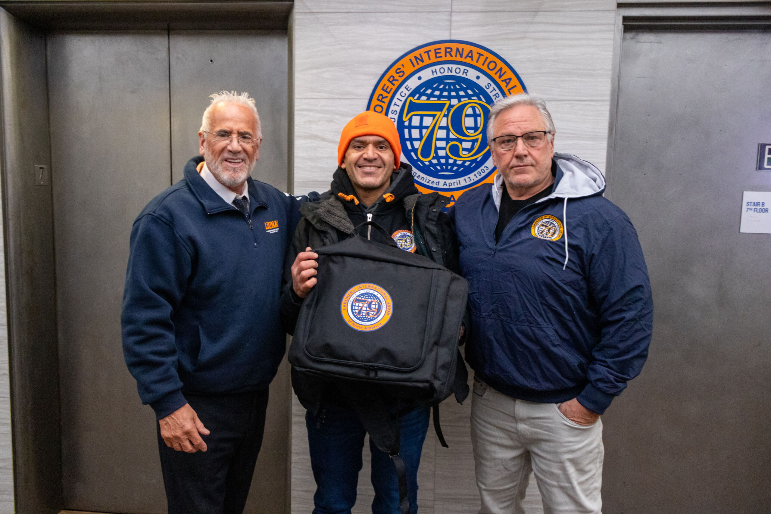 The Local 79 Executive Board invites members to come pick up this year’s bag giveaway! Members in good standing are encouraged to pick up their Local 79 bag between 9am – 4pm on weekdays from the dues department at 131 W 33rd St, 7th floor, New York, NY 10001. Please bring a valid I.D. and your union book. Thank you all for representing our union proudly from your home to your job site. Pictured above is Local 79 Business Manager Tony Vita, Secretary-Treasurer John Norbury and 3rd Year apprentice Jose Rivera.