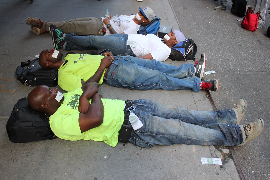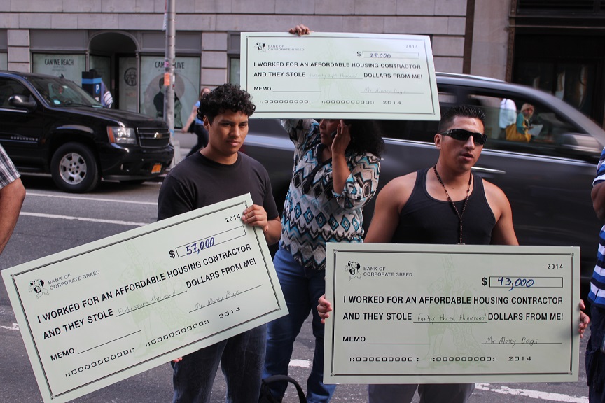 Local 79 members, dressed up in various costumes, gave an unexpected greeting to guests coming to the New York State Association for Affordable Housing’s (NYSAFAH) swanky Annual Summer Cocktail Reception at the Princeton Club on Thursday, July 24. Silenced NYSAFAH workers lay on the sidewalk, while a top-hatted, cigar smoking executive handed out free money, representing the way in which NYSAFAH contractors abuse taxpayer subsidies. Members of Local 79 passed out leaflets expressing outrage that one of NYSAFAH’s major developers would sue affordable housing homeowners who called attention to his firm’s shoddy construction practices. Other members held up checks depicting the tens of thousands of dollars that NYSAFAH contractors have had to pay to workers who have been the victims of wage theft. Inside, several Local 79 members attended the event. They were removed by security after using verbal and visual means to express their opinion of NYSAFAH’s construction practices.