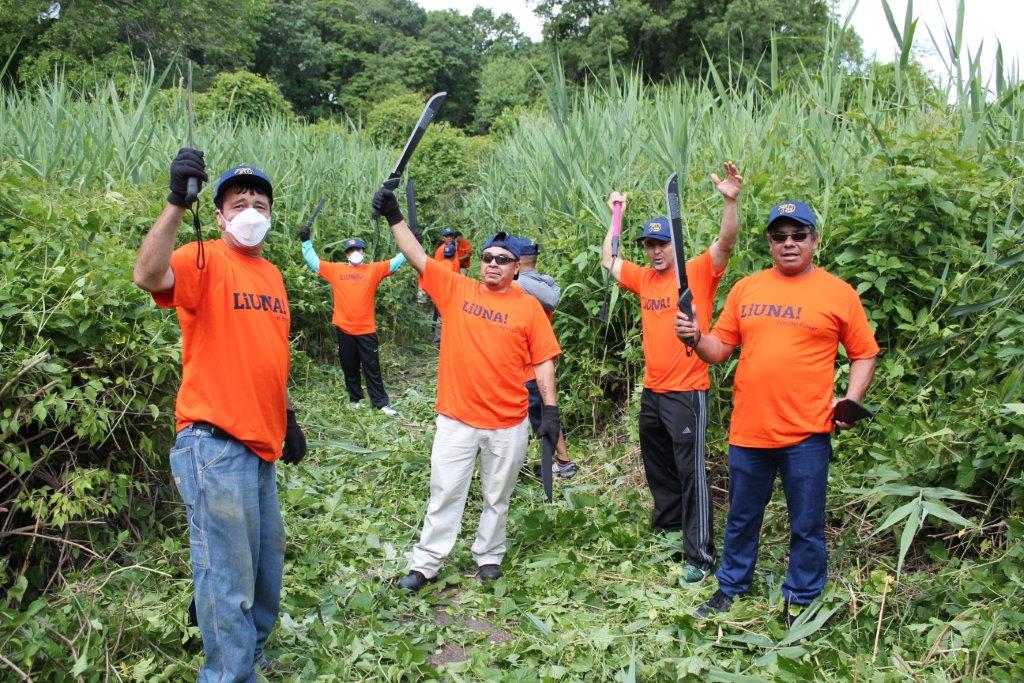 - Local 79 members with machetes for brush clearing on a trail