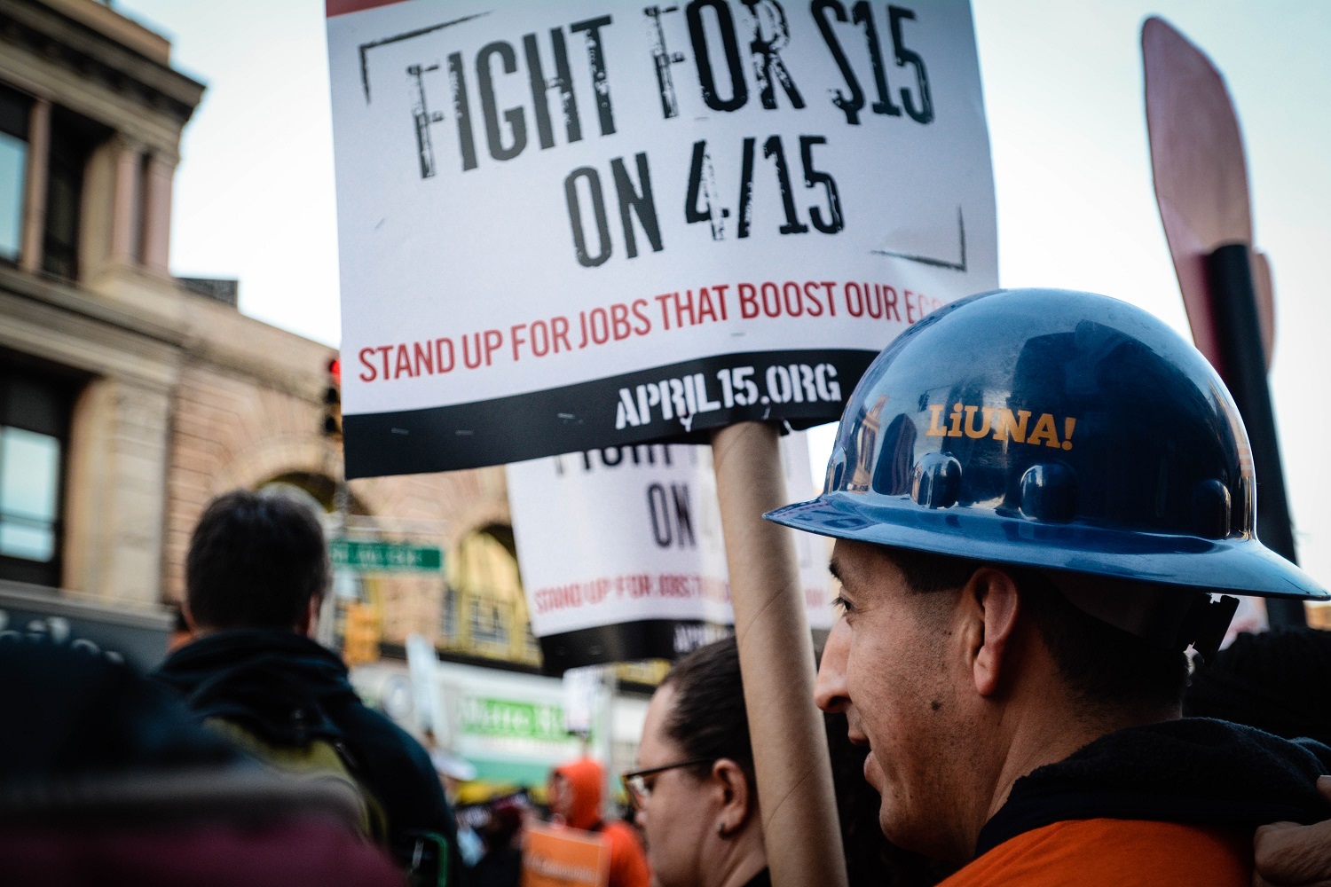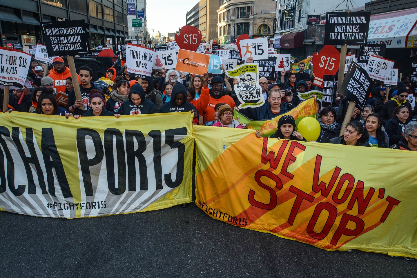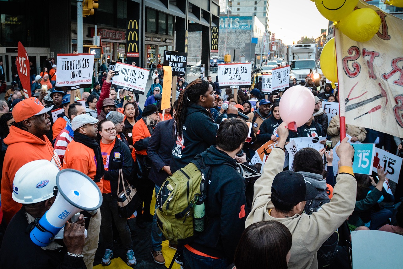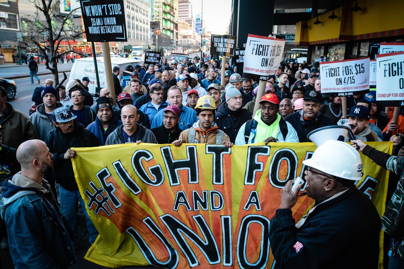 The rally was part of a nationwide day of rallies and protests demanding that the minimum wage be raised to $15 an hour and to give workers the right to form a union without the fear of retaliation.