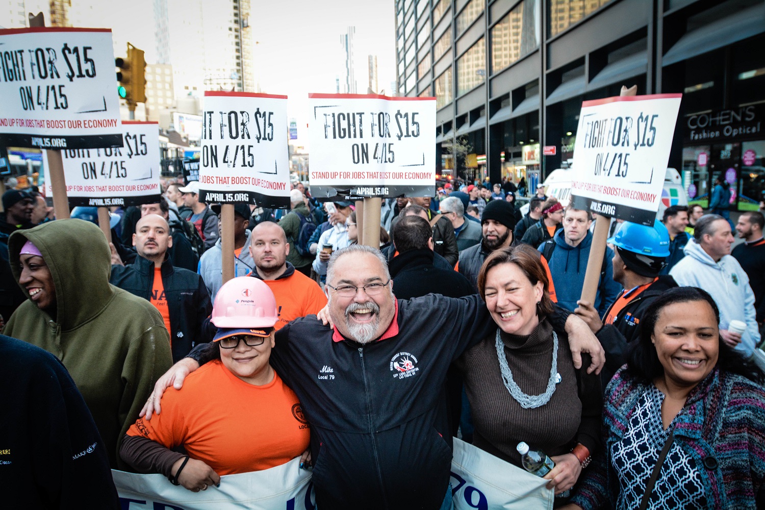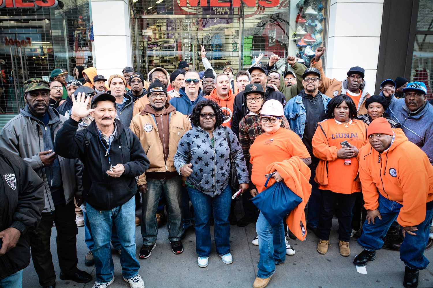 The “Fight for $15” got an early, boisterous start at 6:00 am on Wednesday, April 15, when Local 79 members joined hundreds of construction workers and low-wage workers in Brooklyn to rally for higher wages for low wage workers and union protection. Protestors marched through the streets of Brooklyn, stopping at McDonald’s and at a job site of JDS, a notorious non-union developer. After the rally, Local 79 Business Manager Mike Prohaska said that the “Fight for $15” is “at its core, about social and economic justice for all workers throughout this country. Local 79 is committed to fight for workers to have the right to organize, to be paid a living wage for an honest day’s work, and to stop rich developers like JDS from exploiting the workers of this great City.”
